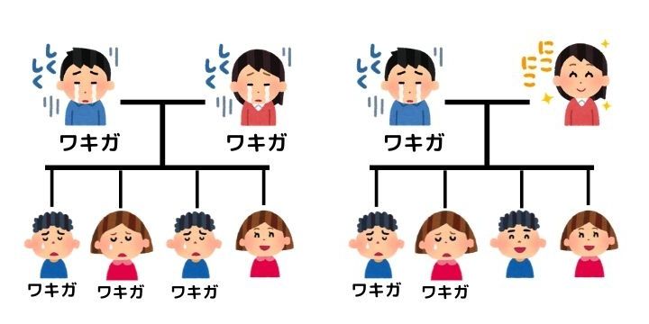 逆に、両親そろってワキガ遺伝子とそうでない遺伝子のセットを持っていた場合は、子どもにはワキガが遺伝しないこともあるんですね。